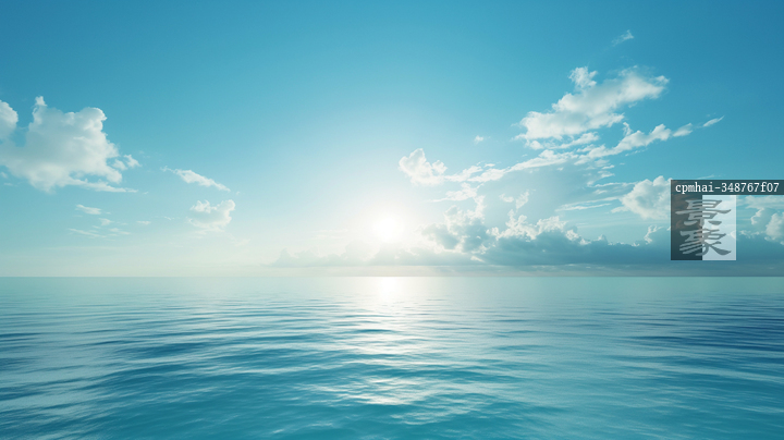图片标题: 平静蓝色背景下的海洋日出景象,带来宁静祥和的氛围