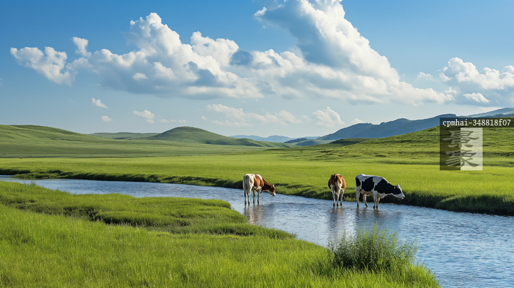 图片标题:     草原上一片宁静的景象,几头奶牛在清澈的小溪旁悠闲地吃草