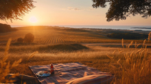 图片标题: 平静蓝色背景下的海洋日出景象,带来宁静祥和的氛围