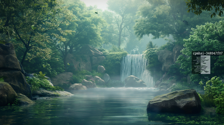 图片标题: 晨雾中的森林溪流