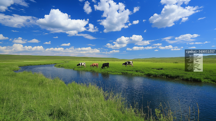图片标题: 广袤草原上的宁静牛群与蓝天白云相映成趣