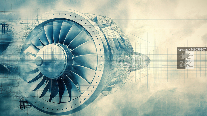 图片标题: 涡轮发动机在云雾中运转的高科技图景,展示现代工程的复杂性与美感