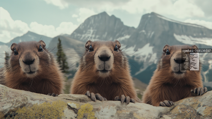 图片标题: 在山脉背景下三只土拨鼠聚集在一起,展示好奇和友好的姿态