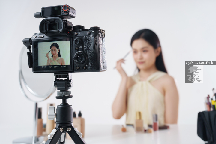 图片标题: 年轻女主播直播美容产品