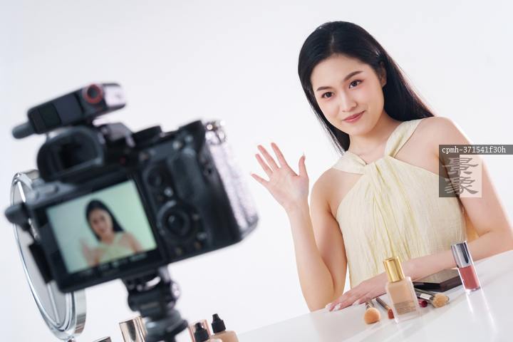 图片标题: 年轻女主播直播美容产品