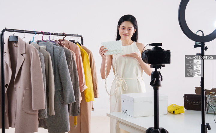 图片标题: 年轻女子直播卖奢侈品女包