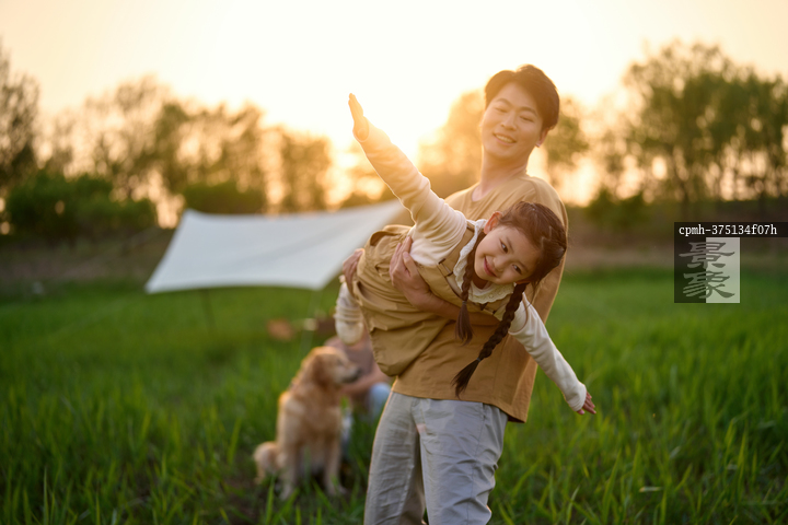 图片标题: 夕阳下父女与狗