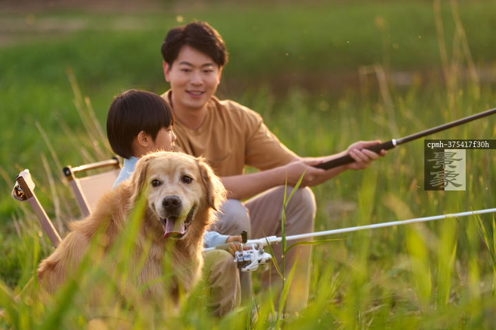 图片标题: 父子田野湖边垂钓郊游
