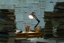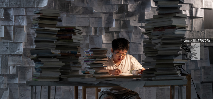图片标题: 疲惫的学生在浩瀚的书海中写作业