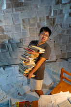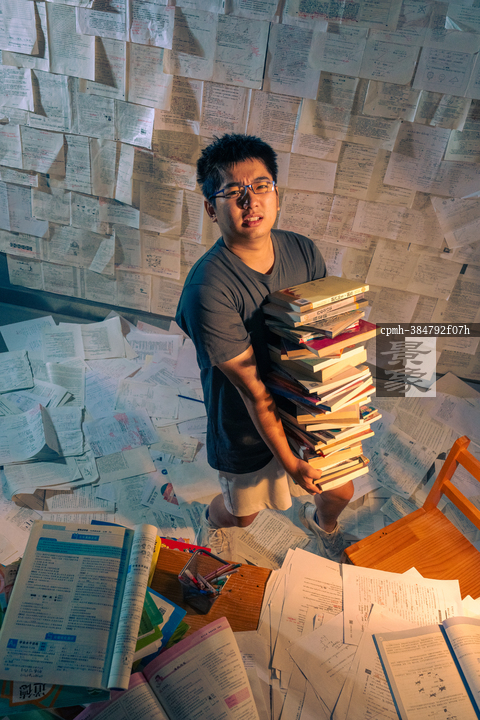 图片标题: 在贴满试卷的屋子抱着厚厚一摞教辅教材的学生