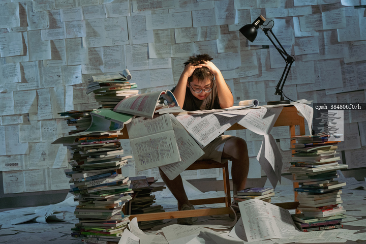图片标题: 疲惫的学生在浩瀚的书海中写作业