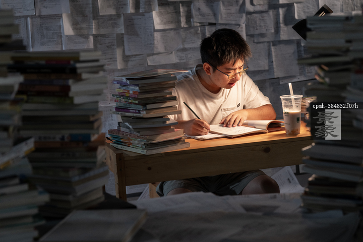 图片标题:     疲惫的学生在浩瀚的书海中写作业