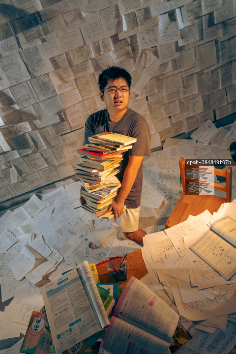 图片标题: 在贴满试卷的屋子抱着厚厚一摞教辅教材的学生