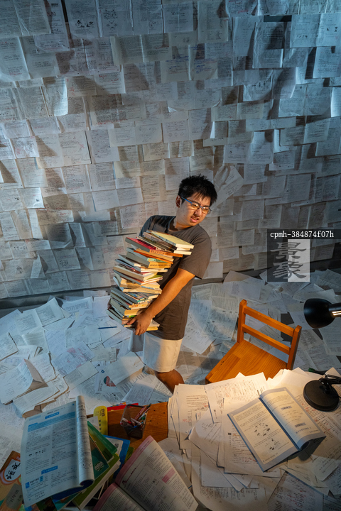 图片标题: 在贴满试卷的屋子抱着厚厚一摞教辅教材的学生