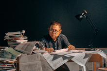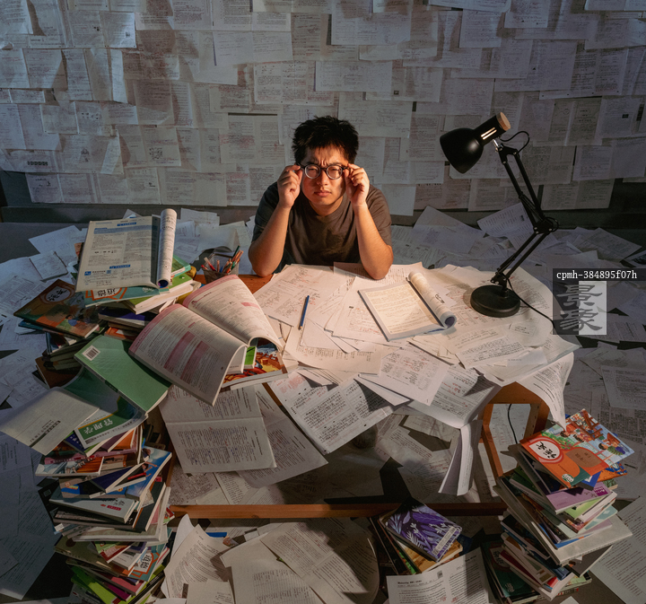 图片标题:     疲惫的学生在浩瀚的书海中写作业