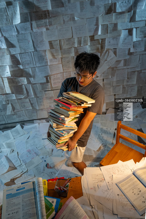 图片标题: 在贴满试卷的屋子抱着厚厚一摞教辅教材的学生