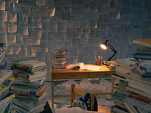 图片标题:     疲惫的学生在浩瀚的书海中写作业