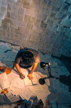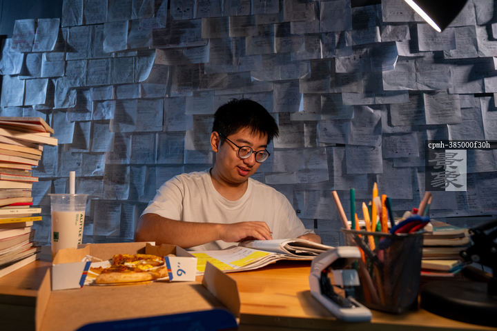 图片标题: 疲惫的学生在浩瀚的书海中写作业
