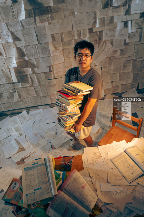 图片标题:     在贴满试卷的屋子抱着厚厚一摞教辅教材的学生