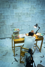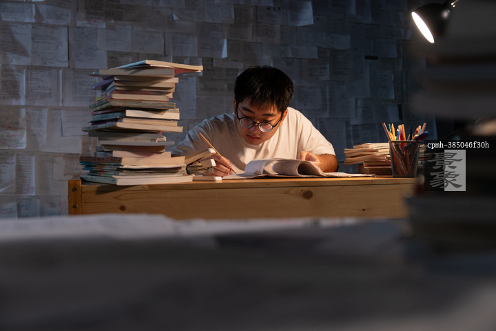 图片标题:     疲惫的学生在浩瀚的书海中写作业