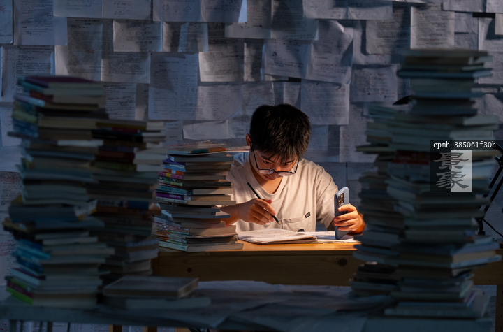 图片标题: 疲惫的学生在浩瀚的书海中写作业