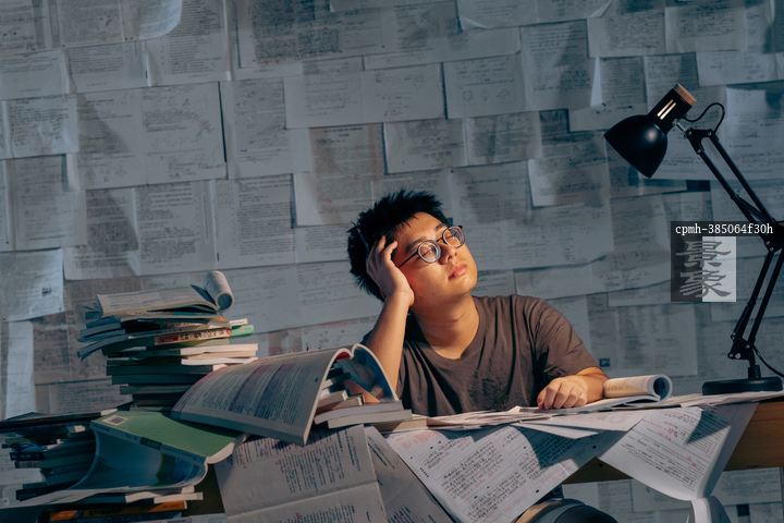 图片标题: 疲惫的学生在浩瀚的书海中写作业