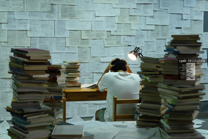 图片标题: 疲惫的学生在浩瀚的书海中写作业
