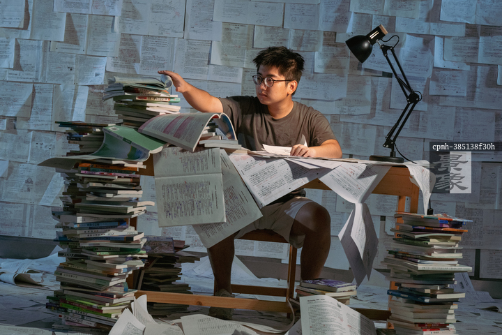 图片标题: 疲惫的学生在浩瀚的书海中写作业