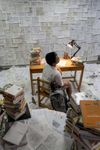 图片标题: 疲惫的学生在浩瀚的书海中写作业