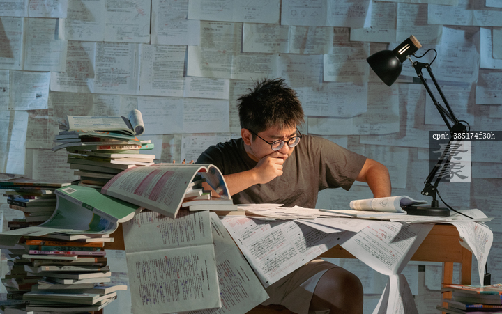 图片标题: 疲惫的学生在浩瀚的书海中写作业