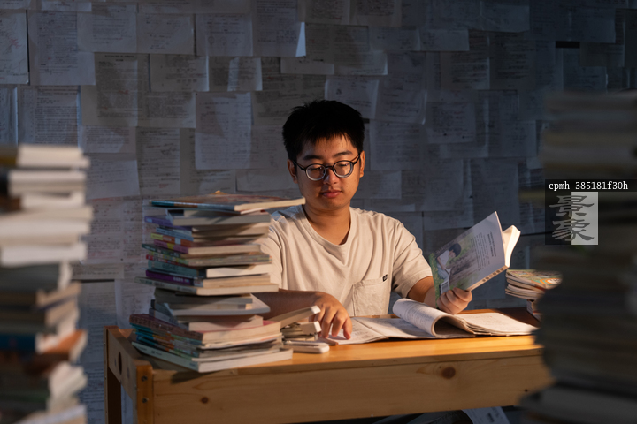 图片标题:     疲惫的学生在浩瀚的书海中写作业