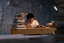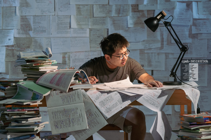 图片标题:     疲惫的学生在浩瀚的书海中写作业