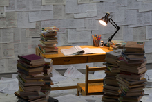图片标题: 疲惫的学生在浩瀚的书海中写作业