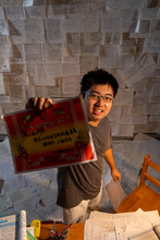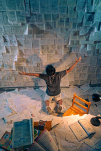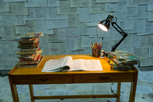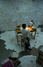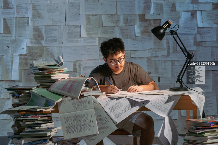 图片标题:     疲惫的学生在浩瀚的书海中写作业