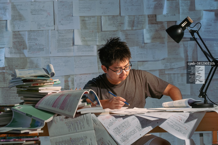 图片标题: 疲惫的学生在浩瀚的书海中写作业
