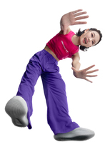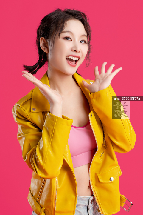 图片标题: 红色背景下的一位快乐青年女人