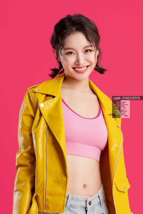 图片标题: 红色背景下的一位快乐青年女人
