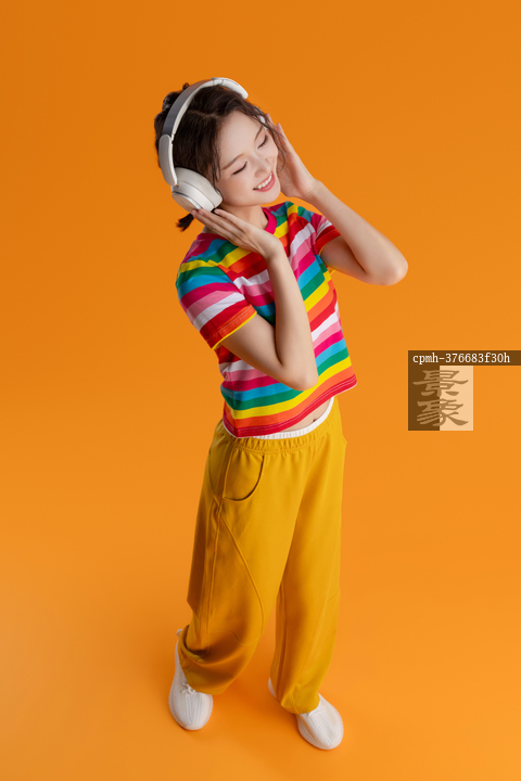 图片标题: 快乐的青年女人戴着耳机听音乐