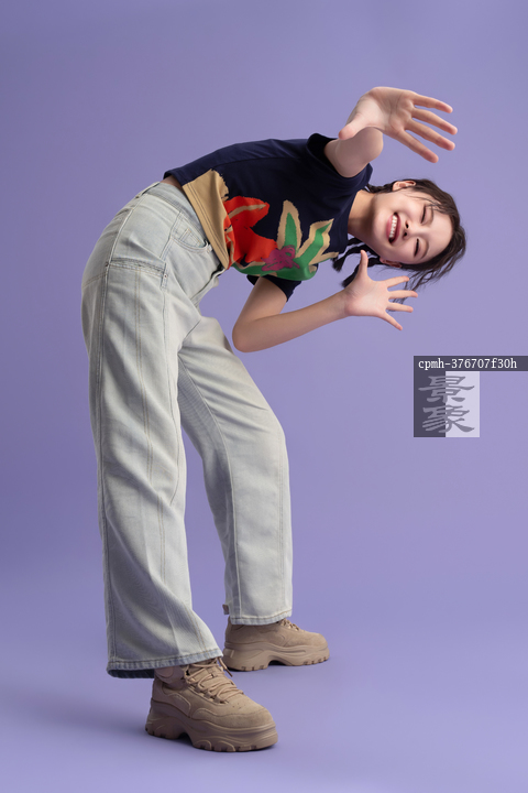 图片标题: 紫色背景下的快乐青年女人