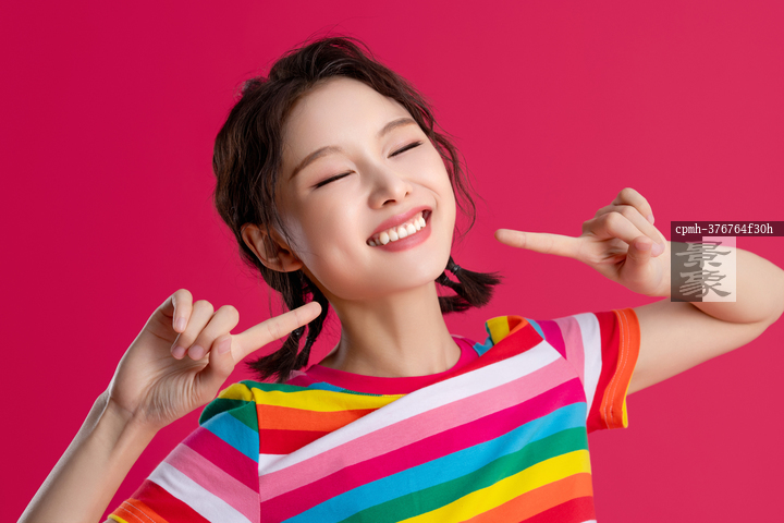 图片标题: 红色背景下的一位快乐青年女人