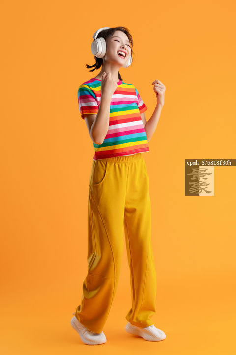 图片标题: 快乐的青年女人戴着耳机听音乐