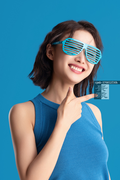 图片标题: 蓝色背景下的青年活力女人
