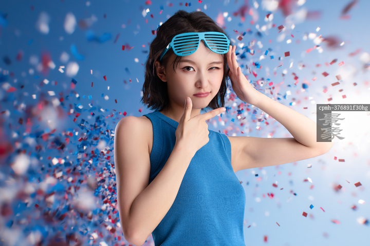 图片标题: 蓝色背景下的青年活力女人