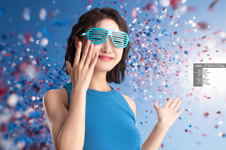 图片标题: 蓝色背景下的青年活力女人
