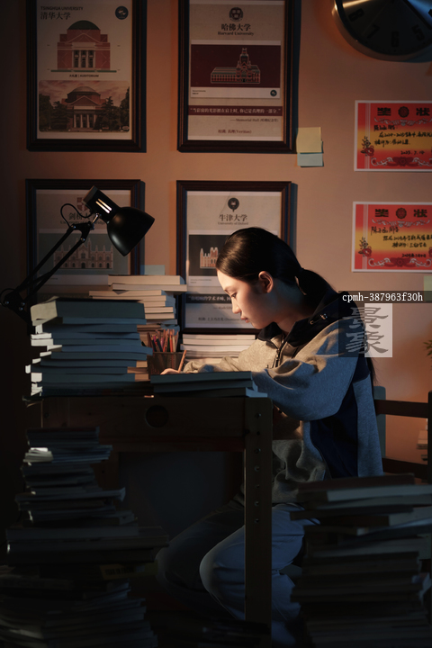 图片标题: 深夜伏案学习的女孩