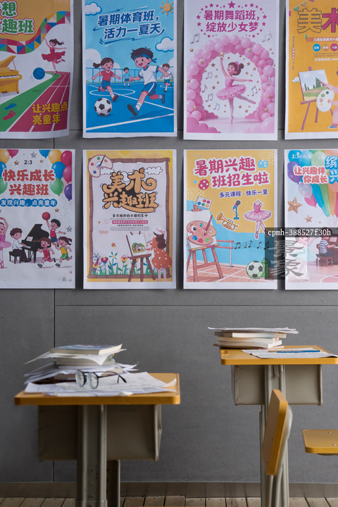 图片标题: 教室里的课桌与海报