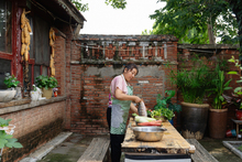 图片标题: 在做饭的一位中年女人高兴的展示食物
