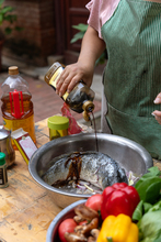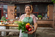 图片标题: 在做饭的一位中年女人高兴的展示食物