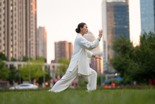图片标题: 一个老年女人在公园练太极拳