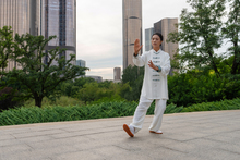 图片标题: 一个老年女人在街心公园练太极拳